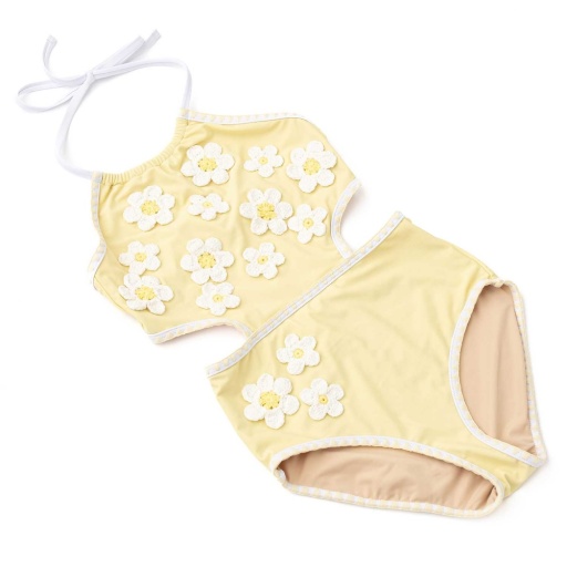 A sunny yellow cut-out swimsuit with sweet 3D daisy appliqués, bringing cheerful texture and playful charm to every splash-filled summer day.