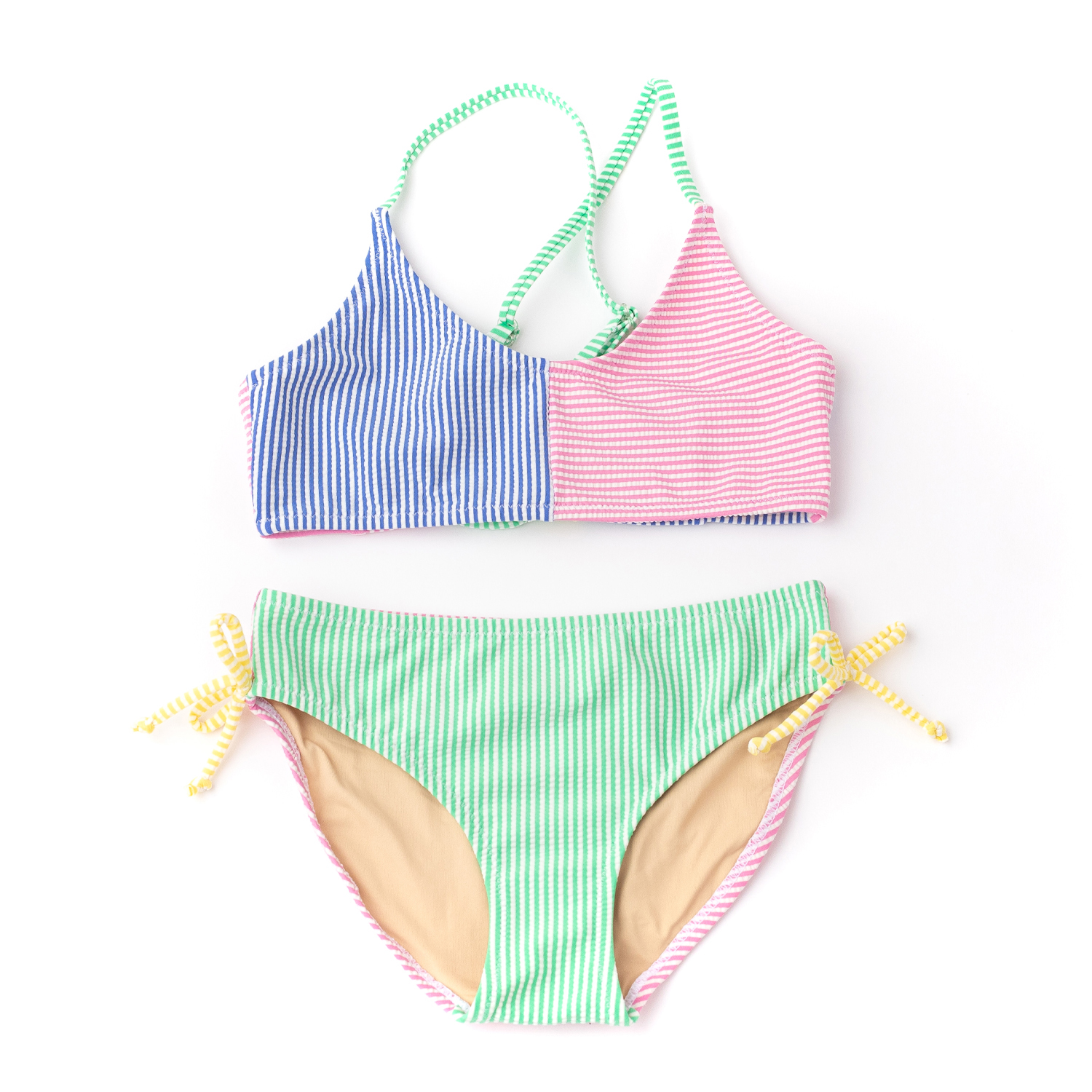 Are you looking for the perfect bikini for your little girl? Look no further! Our Multi Seersucker Girls Tie Back Bikini 7-14 has everything she needs and more! This trendsetting piece of swimwear is specially designed to give your daughter comfort and protection, while also making her look adorable in the sun. The vibrant multi-color stripe pattern features white stripes with accents of pink, green, yellow, and blue. Two thin straps cross at the back and tie securely for a snug fit that won't irritate her sensitive skin so no need to worry about her having any uncomfortable strap marks on sunny days. The material is also moisture-wicking seersucker, which helps keeps her feeling fresh in the pool or at the beach. And its machine washable so you can keep it looking great wash after wash. Let your little one show off her personality and style this summer with our Multi Seersucker Girls Tie Back Bikini 7-14!