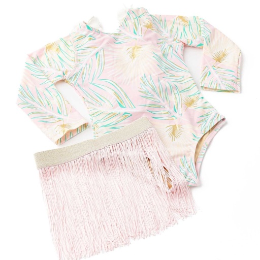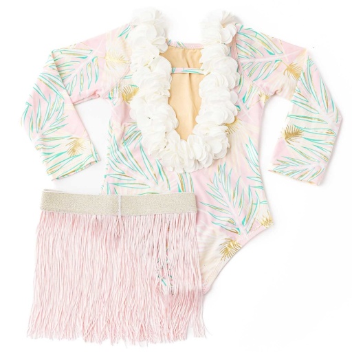 A tropical long-sleeve swimsuit set with a metallic palm print, floral neckline, and a removable fringe skirtperfect for sun-safe hula-inspired play.